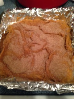 5. Pour into prepared pan, smooth (I didn’t do that very well because I didn’t care) and sprinkle with cinnamon sugar.